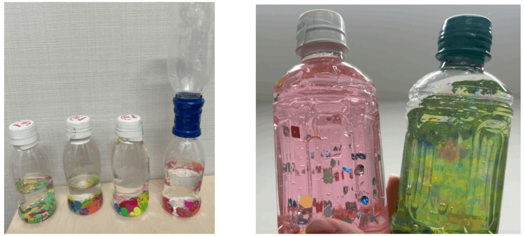 さらに!ペットボトルを掴む、握る、転がす、動かすことで手指の巧緻性を高める効果もあります。それぞれお好きな小物を入れてオリジナルのセンサリーボトルで楽しんでみてください。